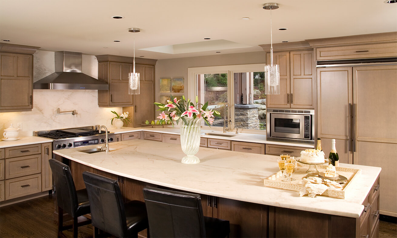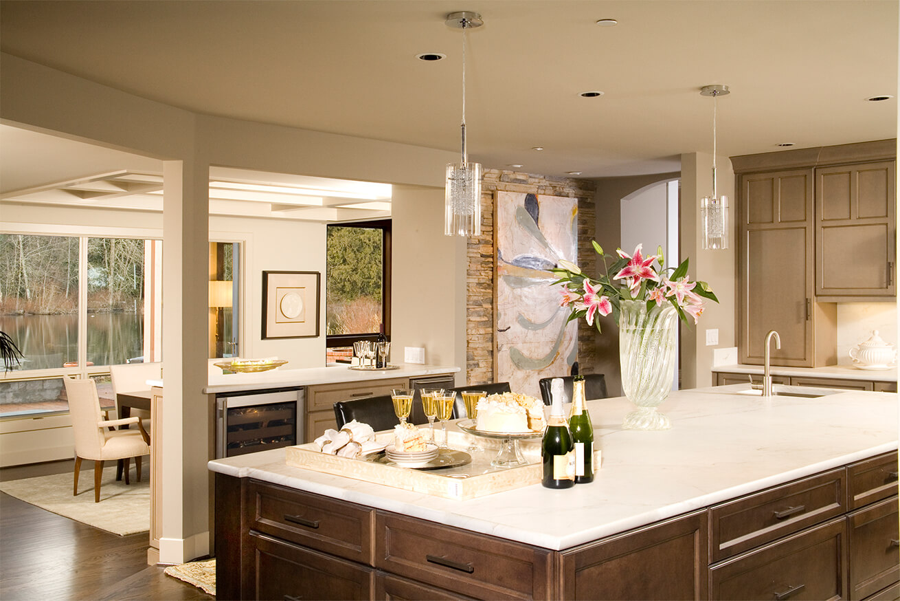 In this extensive remodel and addition project, EGA transformed an uninspired house into a truly elegant home. The architect replaced the heart of the existing house on the Sammamish Plateau in Washington with a soaring structure. This solution simultaneously took full advantage of the lake view, provided a grand entry and tied the front of the property to the back more directly. This then provided the opportunity to create outdoor spaces on both sides of the house. A covered outdoor space on the entry side enjoys the view of the water feature and pond that is also seen from the kitchen.